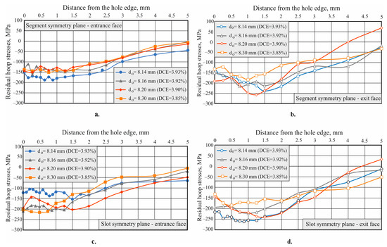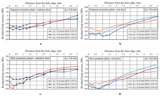 - In general, the final residual hoop stress distribution, depending on the diameter of the pre-processed hole, differs in character in the two planes of symmetry on the entrance and exit faces. The scattering is the least (≈) along the entrance face in the segment symmetry plane and the greatest (≈) along the entrance face in the slot symmetry plane.
