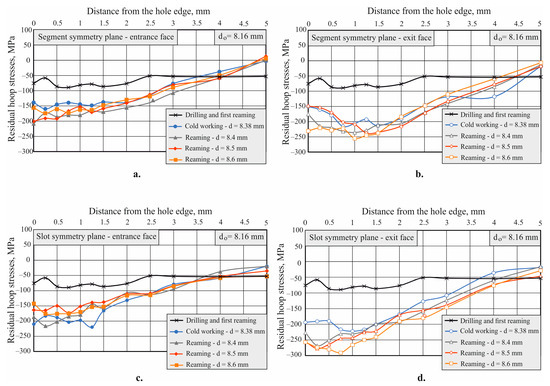 The approach ensuring the same final diameter of the stressed holes is of practical importance. Therefore, the object of comparative research assessed samples with pre-processed holes with different diameters (8.14, 8.16, 8.30 mm) and the same final diameter after reaming. Figure 14 visualizes the final residual stress distribution in the segment and slot symmetry planes on the entrance and exit faces of the samples, depending on the pre-processed hole diameter. Thus, the change in the final residual stress distribution as a function of the cut metal layer thickness after the final reaming could be evaluated. The following is observed: