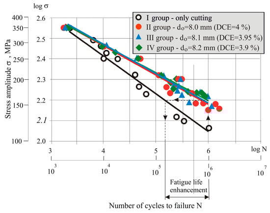 - A slight tendency to change the slopes of the S-N curves in correlation with the nominal diameter of the pre-drilled holes is observed. Although the DCE is the largest for Group II , their corresponding S-N curve shows a tendency toward the lowest value of cycle fatigue strength compared to those for Groups III and IV. The greatest fatigue life is observed in Group IV, whose pre-drilled holes have the largest nominal diameter, i.e., DCE is the smallest (3.9%). The difference in the obtained S-N curves can be explained by the difference in the introduced residual compressive circumferential stresses around the hole after cold working and, above all, by the effect of redistribution of these stresses due to the removal of a plastically deformed layer of metal of different thickness after the final reaming. The appropriate thickness of the metal cut layer via the final reaming minimizes the residual stress axial gradient and, thus, homogenizes the compressive zone.