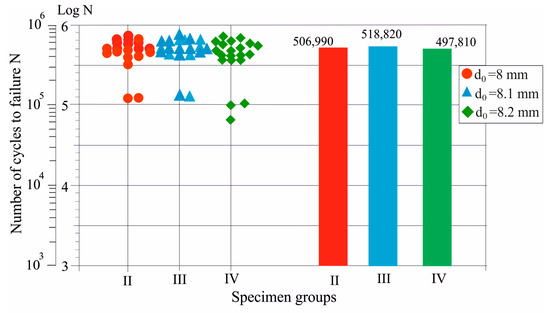 To evaluate the repeatability of the fatigue behavior of specimens whose holes were prestressed using the new method, Groups II, III, and IV (20 specimens each) were subjected to a cyclic tensile pulsation cycle with the same stress amplitude of 170 MPa until complete destruction. The number of cycles to failure was determined for each specimen. The center of clustering was taken as the final number of cycles for each group. Figure 16 shows that the number of cycles to failure of the three groups for a stress amplitude of 170 MPa varies in a narrow range: from 497,450 for Group IV to 518,820 for Group II. These results confirm the observed trend for S-N curves and show that the new method provides a constant fatigue strength for a given stress amplitude.