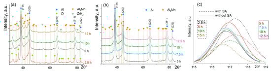 - The dissolution of Mn, Zr, and Cu with further precipitation of the Al6Mn phase occurred during mechanical alloying. For the PCA-free alloy, the dissolution of Zr, Cu, and the Mn solute content of about 5 wt% were observed after milling for 10 h. The grain size measured by TEM was 16 nm, which was the same as the crystallite size estimated by XRD. Due to the high solute content, fine precipitates and nano-grained structure, the MA granules exhibit a hardness of ~500–650 HV.