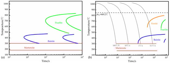 In order to obtain more accurate simulation results for the heat treatment, the TTT (Time–Temperature Transformation) diagram and CCT (Continuous Cooling Transformation) diagram of the H13-Ti steel are calculated using thermodynamic calculation software JMatpro V7.0 following austenitization at 1040 °C, as depicted in Figure 2. The accuracy of the software’s calculation results is validated through numerous experiments [20,21,22]. The initial transformation temperatures for bainite, ferrite, and martensite are determined as 478.7 °C, 849.9 °C, and 302.6 °C, respectively. The temperature is 266.5 °C at a 50% martensitic transformation, and 182.7 °C at a 90% martensitic transformation. The addition of titanium to H13 steel enhances the efficiency of martensite transformation, resulting in the improved strength and hardness of the material matrix [23]. Using the TTT diagram and the point value, the and values in Formula (6), and the value in Formula (7) are determined.