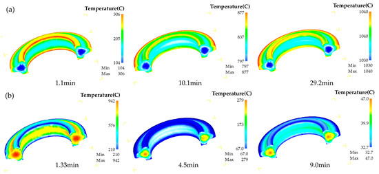 Temperature fields of H13-Ti steel for (a) heating process for 1.1, 10.1 and 29.2 min, respectively, and (b) water cooling process for 1.33, 4.5, 9.0 min, respectively.