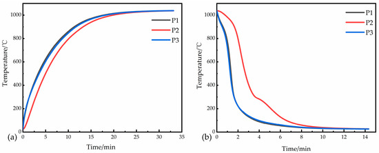 The simulation modeled the evolution of the temperature field in the cutter ring as it is heated from room temperature to 1040 °C, followed by complete austenitization and quenching in water. The representative results are shown in Figure 5. The temperature gradient around the cutter ring edge gradually shifts towards the center. Temperature variations at the sampling point during the extraction heating process are depicted in Figure 6a. Point P2 (the center of the tool) exhibits a slower heating rate and a lower local temperature compared to points P1 and P3. However, the temperature variance between P1 and P3 remains insubstantial throughout. As the heating duration extends, the temperature gradient between the surface and the center diminishes, leading to a more uniform temperature field. Figure 6b illustrates the temperature variation over time during the cooling process. Quenching results in the faster cooling of the workpiece exterior compared to the slower cooling of the core. The observed inflection point arises from martensitic transformation occurring at this temperature (302.6 °C, Figure 2), with point P2 exhibiting the most pronounced inflection. On one hand, the direct contact between the workpiece exterior and the cooling medium accelerates heat transfer. On the other hand, the surface layer undergoes phase transition during cooling, releasing latent heat transferred to the core, thereby maintaining a higher core temperature and slowing the overall cooling rate.