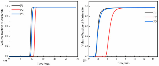 Variations in austenite and martensite phases as a function of time under (a) the heating process and (b) the water cooling process.