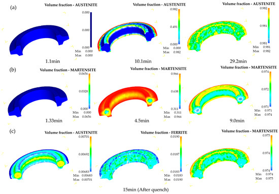 The volume fractions of different phases during (a) heating process for 1.1, 10.1, and 29.2 min, respectively, and (b) water cooling for 1.33, 4.5, 9.0 min, and (c) 15 min, respectively.
