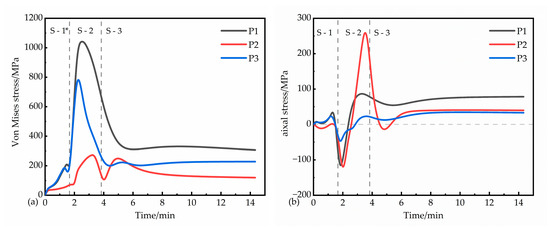Evolution of (a) Von Mises stress and (b) axial stress of sampling points during quenching process. * S-1 (quenching stage 1) is no martensitic transformation, S-2 (quenching stage 2) is martensitic transformation in the surface layer but no phase transformation in the center, S-3 (quenching stage 3) is martensitic transformation in the center to the end of quenching.