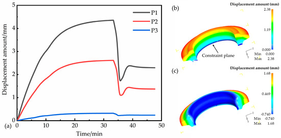 (a) The total displacement evolution curves of sampling points during heat treatment process; (b) total displacement field; (c) displacement field in the axial direction.