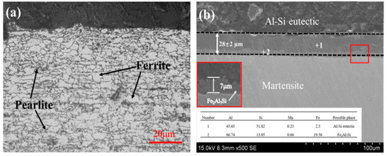 The thickness of the base metals, AA5052 aluminum alloy (Guangdong Xingfa Aluminium Co., Ltd., Guangdong, China) and 22MnB5 steel (with or without Al-Si coating), used in this experiment were 2.0 mm and 1.8 mm, respectively. These base metals had dimensions of 100 mm× 50 mm. For this experiment, the Zn-Al22 wire was chosen as the filler metal, which had a diameter of 1.6 mm. Table 1 provides the elemental content of the the22MnB5 steel (Baosteel Co., Ltd., Shanghai, China), AA5052 aluminum alloy, and Zn-Al22 filler wire (Shandong Szeshang Welding Materials Co., Ltd., Shandong, China). Figure 1 shows the microstructure of the 22MnB5 steel with and without coating. In terms of uncoated steel, pearlite and ferrite were observed (Figure 1a), while only martensite was observed due to the hot stamping process inducing phase transformation [14]. In addition, the Al-Si coating with the thickness of 28 ± 2 μm was clearly observed on the steel substrate (Figure 1b). This coating consisted of an Al-Si eutectic phase and Fe2Al7Si intermetallic compound, where the IMCs were continuously distributed between the Al-Si eutectic phase and steel substrate with the thickness of 7 μm [23,24,25].
