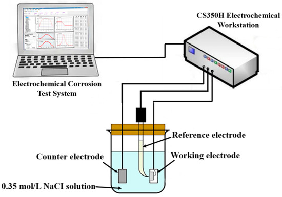 A CS350H electrochemical workstation (Wuhan Corrtest Instruments, Wuhan, China) and three-electrode system were used for the electrochemical corrosion testing, as shown in Figure 3. The saturated calomel electrode was used as the reference electrode. The electrochemical corrosion sample was used as the working electrode, and the platinum electrode was used as the counter electrode. A neutral solution of 0.35 mol/L NaCl was used in the electrochemical corrosion. In the electrochemical corrosion test, except for the polished cross-section, the rest of the material was covered with epoxy resin, and only the cross-section of the sample was retained as the surface to be tested. The samples were immersed in the NaCl neutral solution for 30 min to obtain uniform corrosion. After the open-circuit potential (OCP) became stabilized, the potential dynamic polarization curve test scanned from negative potential to positive potential, and the applied potential varied in the range of −1.5 to +1 V. The scan speed and sampling frequency during the test were 2 mV/s and 2 Hz, respectively. The electrochemical impedance spectroscopy (EIS) was conducted when the open-circuit potential is relatively stable, with the amplitude of the sinusoidal voltage set to 10 mV and the frequency set to 1000 to 0.1 Hz.