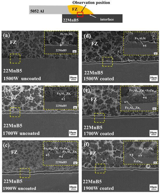 SEM analysis at the FZ/steel interface in the Al/uncoated steel and Al/Al-Si coated steel joints with the laser power varying from 1500 to 1900 W: (a~c) Al/uncoated steel joints; (d~f) Al/Al-Si coated steel joints.