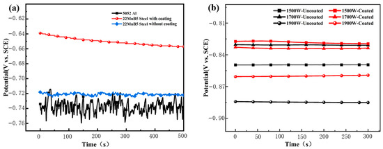 In order to accurately measure the voltage sweep range of the specimen’s polarization curve, it is necessary to identify the open-circuit potential (OCP) and thus determine the voltage sweep range [17]. The open-circuit potential is the difference between the working electrode and the reference electrode without load, which is mainly related to the material and the corrosive solution. The change in the OCP reflects the gradual transformation of the electrode from an unstable to a stable state in the electrolyte solution.