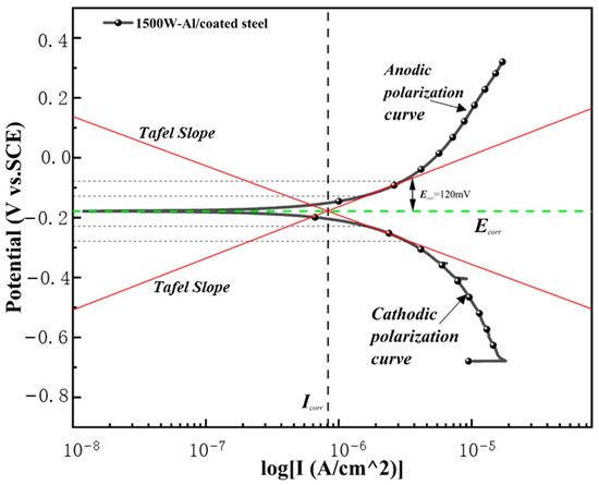 Figure 7 depicts a schematic diagram of the kinetic potential polarization curve of a typical laser Al/steel joint. The dynamic potential polarization curve consists of a cathodic semi-log polarization curve and an anodic semi-log polarization curve, where the intersection of the two polarization potential curves is the self-corrosion potential, Ecorr. Ecorr represents the stable corrosion state of the potential in the absence of an applied current; to some extent, it is also a thermodynamic parameter that reflects the corrosion tendency of the joint. The relatively small Ecorr indicates that the joint in the natural state is more prone to corrosion. The self-corrosion potential, Ecorr, only reflects the corrosion trend, and there is no certain relationship with the corrosion rate [35].