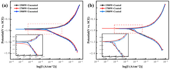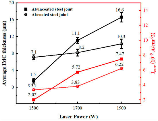 Figure 9 details the self-corrosion current density with the change in power for the Al/steel welded joints with or without coating. With the increased laser power, the self-corrosion current density of Al/uncoated steel were 2.02 × 10−5 A/cm2, 5.72 × 10−5 A/cm2, and 7.47 × 10−5 A/cm2, and the self-corrosion current density of Al/Al-Si coated steel were 3.35 × 10−5 A/cm2, 3.83 × 10−5 A/cm2, and 6.22 × 10−5 A/cm2. It was obvious that the self-corrosion current density of both joints increased with the increase in laser power, which further indicated that increasing the laser power was likely to reduce the corrosion resistance of the joints. By comparing the self-corrosion current density under the same power, opposite trends were observed for various laser powers. The self-corrosion current density of the laser Al/Al-Si coated steel joints were higher as compared to the joints of Al/uncoated steel (3.35 × 10−5 A/cm2 vs. 2.02 × 10−5 A/cm2) at 1500 W. On the contrary, at a laser power of 1700 and 1900 W, the self-corrosion current density of the Al/uncoated steel joints was greater as compared to the Al/Al-Si coated steel joints. Combining the effects of laser power and steel surface condition on the IMC thickness, there was evidence of a high correlation between the IMC thickness and self-corrosion current density in Figure 9. Therefore, according to the findings, interface intermetallic compound thickness and subsequently the corrosion properties of the laser joints were influenced by both the laser power and coating [36,37]. In a word, the thinner the IMC layer, the lower the self-corrosion current density, and the better joint corrosion performance.