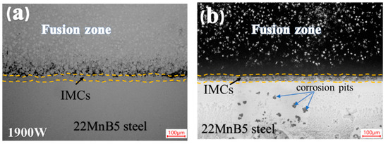 Interface morphology of Al/coated steel joints in 1900 W: (a) before corrosion, (b) after corrosion.