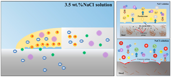 In order to further investigate the Al/steel welding joint corrosion mechanism, typical corrosion morphology at the interface of laser Al/coated steel joints at a laser power of 1900 W was observed (Figure 11). Figure 12 shows the schematic diagram of the corrosion mechanism of Al/steel welded joints in 3.5% NaCl solution. The corrosion pits were found on the steel surface, which was due to the reaction of Cl- with the hydroxide of Fe and the formation of complexes on the steel surface accelerating the pitting corrosion [40]. It can be seen that there is a darker color in the FZ and a brighter color of the joint steel side in Figure 11b. This indicates that the FZ corrodes more severely than the steel. This was because the galvanic corrosion occurred between the FZ and the steel, where the FZ with a lower corrosion potential exhibited a protective effect on the steel. At the same time, the FZ near the IMC layer experienced intense corrosion; this was because of the galvanic corrosion between the FZ and IMC layer. The IMC layer was a cathode which accelerated the corrosion of Al and Zn in the FZ. There was slight corrosion of steel adjacent to the IMC layer, which was due to the IMC layer as the anode by an oxidation reaction protecting the steel from corrosion [41]. During the corrosion process of the Al/steel joints, Zn and Al in FZ and IMC were dissolved in large quantities to generate Zn2+ and Al3+ cations, and slight corrosion occured in the surface of steel that generated Fe3+ cations, which react with OH− ions in the solution that generate products such as Al(OH)3, Zn(OH)2, and Fe(OH)3 [42].