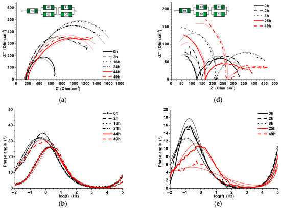 Furthermore, the corrosion of carbon steel evaluation performed by EIS measurements is shown in Figure 3. The analyses of these curves were done by fitting the data to an equivalent circuit as is shown in the inset of Figure 3a,d, composed by a solution resistance , resistance and capacitance for the and respectively corresponding to the double layer, and resistance and capacitance for the and respectively corresponding to the corrosion products layer [26,27,28]. The kinetic parameters obtained from fitting are tabulated in Table 2.