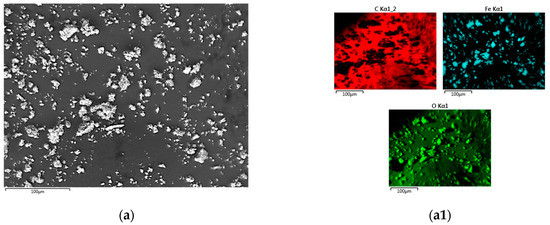 SEM and EDS analyses of the surface oxide layer removed from immersed carbon steel WE immersed in pure RO and RO wash water at different PLS concentrations for 48 h. (a–d) SEM images, and (a1–d1) elemental distribution of elements.