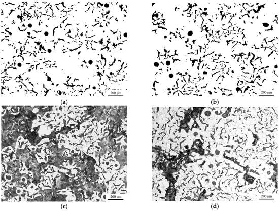 Images showing the graphite morphology of (a) HC1 and (b) HC2 and the matrix of (c) HC1 and (d) HC2.