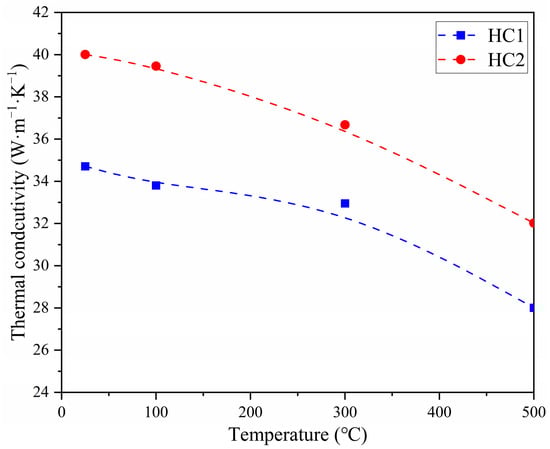 Table 3 summarizes the tensile strength and macrohardness of CGI discs. HC1 showed higher mechanical properties than those of HC2, attributed to the distinct microstructure mentioned earlier. The HC1 brake disc possessed a higher tensile strength compared to that of the HC2 brake disc, suggesting that it may have superior resistance to thermal cracking under equivalent thermomechanical stresses [9]. Moreover, the higher macrohardness and ferrite microhardness in the HC1 brake disc implied better wear resistance under the same temperature [11]. However, the resistance to thermal fatigue cracks and the wear capacity of the brake disc were also associated with its braking temperature and temperature amplitude during thermal cycles [19]. As shown in Figure 4, a larger ferrite proportion led to higher thermal conductivity in HC2 compared to HC1. The matrix type had no significant influence on the thermal expansion coefficient. The average thermal expansion coefficients of HC1 and HC2 from room temperature to 500 °C were 14.4 · 10−6 K−1 and 14.1 · 10−6 K−1, respectively. These differences in the thermal and mechanical properties were also indeed expected, considering the contradictory effects associated with the proportion and strength of ferrite [14,15,16,17].