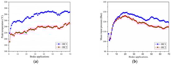 Summaries of (a) peak temperatures and (b) mean input pressures during the brake applications.