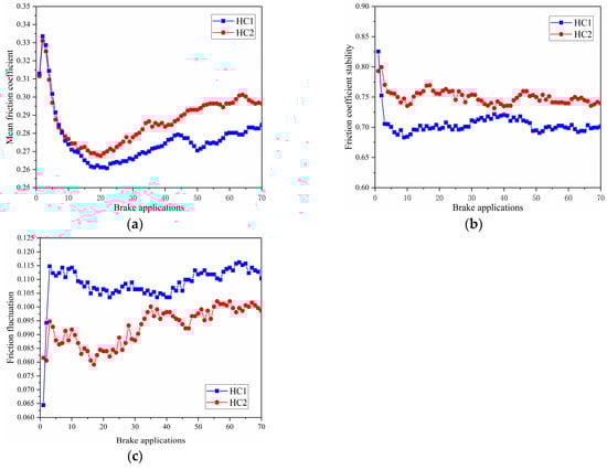 The mean friction coefficients between the two discs and their pads are summarized in Figure 6a. It is evident that both the mean friction coefficients of the HC1 and HC2 pairs (disc–pads) initially decreased and then increased after 20 applications. Like the patterns of the mean input pressure, this finding can also be explained by the contradictory effects of disc temperature, as mentioned above. Moreover, the mean friction coefficient of the HC2 pair was higher than that of the HC1 pair after 10 applications. This is consistent with the pattern of mean input pressure. In other words, the higher ferrite content in HC2 resulted in a higher thermal conductivity. This led to a lower peak temperature during braking applications, as shown in Figure 5a, and a lower fade in the friction coefficient compared to that of HC1. This also explains the curves observed in Figure 5b, where the input pressure for HC2 was lower.