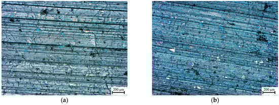 The optical micrographs of the worn surfaces are shown in Figure 7. Nonuniform reticular cracks were observed on the HC1 disc, and several long cracks appeared on the HC2 disc. Moreover, the cracks on the surface of HC1 appeared shorter and denser, whereas those on the HC2 surface were longer and sparser. To calculate the density of the cracks, a grid with four horizontal lines was overlaid onto the micrograph of the worn surface. The points where the grid intersected with the cracks were counted. The density of cracks was then characterized as the number of intersecting points per millimeter of length. The average crack densities of HC1 and HC2 were 5.6 per millimeter and 2.7 per millimeter, respectively. This difference is consistent with the above analysis. Higher disc temperatures and pressure loads increased the thermomechanical stress and aggravated the thermal cracking of the HC1 disc. This indicates that, although the high ferrite content in HC2 reduced the strength of the matrix and its crack resistance, it increased the thermal conductivity of the CGI brake disc, thus achieving lower thermal stress and a lower density of thermal cracks.
