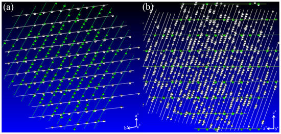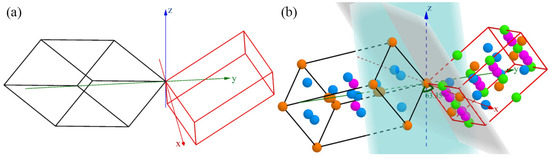 In the above section, we have explained the crystal structure of the Al12.48Fe6.52 phase and Al5.72Fe2 phase, respectively. In this section, the orientation model of real space will be constructed through the orientation matrix of these two phases in reciprocal space. Please refer to Appendix A for the specific construction method of structure models for intergrowth Al12.48Fe6.52 phase and Al5.72Fe2 phase in real space. First, the orientation matrix of two phases in reciprocal space is obtained by APEX3 software (v2018.1-0), and then the orientation relationship of two phases in real space is obtained by the basic correspondence between reciprocal space and real space [28], and the orientation model of two-phase single cell edges in real space is obtained. As shown in Figure 8a, the black and red frames show the cell edges of the Al12.48Fe6.52 and Al5.72Fe2 phases, respectively. Finally, the final orientation model is obtained by adding atoms to the two-phase cell edges. In Figure 8b, the left shows the unit cell of Al12.48Fe6.52, and the right shows the unit cell of Al5.72Fe2. It is interesting to find that the angle between the crystal plane of Al12.48Fe6.52 (001) and the crystal plane of Al5.72Fe2 (100) is 63.35°.
