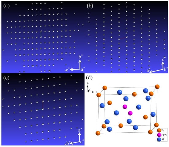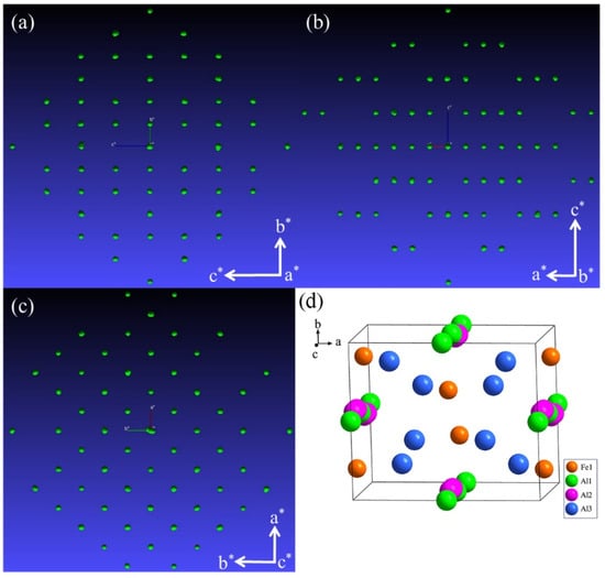 The diffraction patterns of the Al2Fe and its crystal structure: (a) Projection along the a*-axis; (b) Projection along the b*-axis; (c) Projection along the c*-axis; (d) Crystal structure of Al2Fe phase.