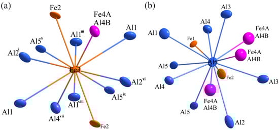 Environment diagram of atoms: (a) Fe3 atom; (b) Al6 atom. Symmetry codes: (i) −x, −y, −z + 1; (iii) x − 1, y, z; (vii) −x, −y, −z; (viii) −x + 1, −y, −z; (ix) −x, −y + 1, −z; (x) x, y − 1, z; (xi) x, y, z − 1.