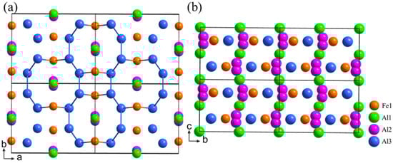 Then, we focus on the crystallographic feature of the Al5.72Fe2 phase. Figure 6a shows the 2 × 2 × 2 supercell of Al5.72Fe2 projected along the [001] direction. The Al1 and Al2 atoms (designated in green and pink color, respectively) are surrounded by a hole composed of eight Al3 atoms and two Fe1 atoms (designated in blue and orange color, respectively). The distance between Al1 and Al2 is only 0.7982 Å, confirming that both have to be partially occupied atoms. Figure 6b shows a projection of the Al5.72Fe2 supercell along the direction [100], where one can see that the Al1 and Al2 atoms are alternatively distributed along the c-axis.