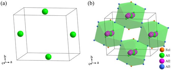 In the following, the building units of the Al2Fe phase have been analyzed by applying the nanocluster method as integrated into the ToposPro software (Version 5.5.2.0, programed by V. A. Blatov and A. P. Shevchenko). One finds that the crystal structure model can be described by two cluster types: Fe3 (1) (1@12) and Al6 (1) (1@13). Among them, the Fe3 (1) (1@12) cluster is an icosahedral cluster with the Fe3 atom as the center, and the Al6 (1) (1@13) is a 21-dihedral cluster with an Al6 atom located at the center. Figure 4a shows the centers of the aforementioned different clusters in the unit cell. As shown in Figure 4b, the Al6 (1) (1@13) clusters are connected with Fe3 (1) (1@12) clusters either by common vertex, edge, or plane, while two Al6 (1) (1@13) clusters are connected with a common plane. Two Fe3 (1) (1@12) clusters along the a-axis are also connected by a common edge. Figure 5 shows the environments of Fe3 and Al6 atoms. It can be seen that the Fe3 atom is surrounded by 12 atoms while the Al6 atom is surrounded by 13 atoms.