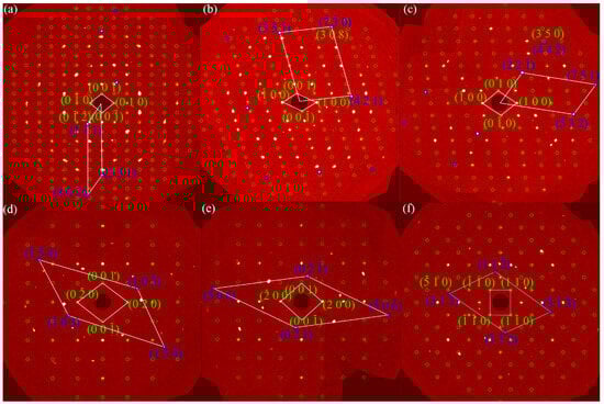 The precession images of intergrowth crystals: (a) Al12.48Fe6.52 (0kl), (b) Al12.48Fe6.52 (h0l), (c) Al12.48Fe6.52 (hk0), (d) Al5.72Fe2 (0kl), (e) Al5.72Fe2 (h0l), (f) Al5.72Fe2 (hk0).