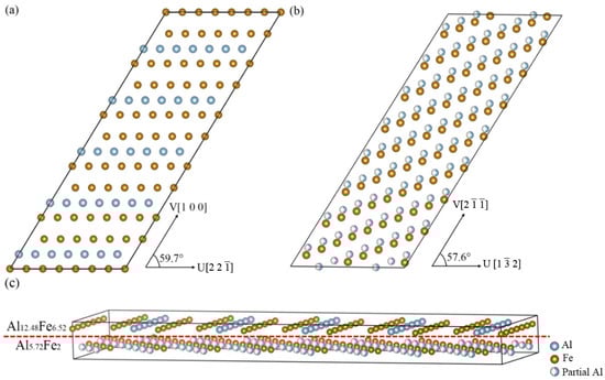 Furthermore, a preliminary interface model of these interface relationships was built. The OR1 orientation relationship: [100] Al12.48Fe6.52//[11] Al5.72Fe2, (0) Al12.48Fe6.52//(111) Al5.72Fe2 is used as an example. For the (0) Al12.48Fe6.52 surface model, as shown in Figure 10a, the u and v directions are parallel to [22] and [100], respectively. At this time, the lattice parameters of the surface of Al12.48Fe6.52 (0) are u = 17.685 Å, v = 4.857 Å, θ = 59.669°. For the surface model of (111) Al5.72Fe2, as shown in Figure 10b, the u and v directions are parallel to [12] and [2], respectively. The lattice parameters of the surface of (111) Al5.72Fe2 are as follows: u = 22.284 Å, v = 17.079Å, θ = 57.611°. As the mismatch between Al12.48Fe6.52 (0) surface and Al5.72Fe2 (111) surface is very large in the u and v directions. It is necessary to build a model of the supercell interface to satisfy the periodic boundary conditions. Since it is difficult to eliminate the mismatch in the u and v directions when constructing very large supercells, relatively small mismatches can be constructed by 5 (u) × 7 (v) (0) Al12.48Fe6.52 and 4 (u) × 2 (v) (111) Al5.72Fe2 surface models. The mismatches in the u and v directions of the two surfaces are δ (u) = 0.804% and δ (v) = 0.468%, respectively. The lattice parameters of Al12.48Fe6.52 and Al5.72Fe2 on both sides of the interface are averaged by applying a certain strain to eliminate the two-phase lattice parameters of the interface. The atomic interface model of Al12.48Fe6.52(0)/Al5.72Fe2(111) is shown in Figure 10c, red dot lines represent the dividing line between the Al12.48Fe6.52 (0) surface and Al5.72Fe2 (111) surface. It can be seen that the atomic arrangement law on the surface of Al12.48Fe6.52(0) is that two layers of Fe atoms and one layer of Al atoms are alternately arranged, and the atomic arrangement law on the surface of Al5.72Fe2(111) is that one layer of Al atoms and one layer of Fe atoms are alternately arranged.