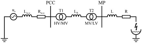 where stands for the effective high voltage at the PCC. The values of short-circuit resistance and reactance values are derived from the reactance/resistance ratio as follows:
