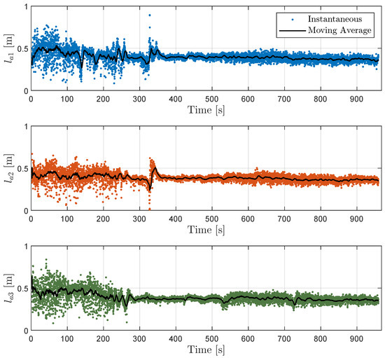 The comprehensive dataset facilitated the calculation of estimated arc length values for all three lines using the Equation (28), as shown in Figure 3. It is important to note that the dataset does not include the entire heat, but covers the measurements from the last bucket charge through the melting phase to the refining phase. The method for estimating the arc length is based on measuring the effective arc voltage over a single signal period. As shown in Figure 3, a significant variability in arc length was observed during the melting phase, which then stabilizes during the refining phase. This pattern is reflected in the analysis of the moving average arc length, which also shows fluctuations during the melting phase before stabilizing in the refining phase. These observations highlight the dynamic nature of the melting process and underline the crucial role of arc length monitoring in the efficient control and optimization of EAF operation.
