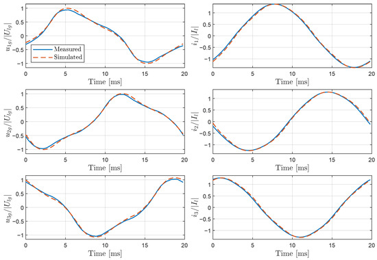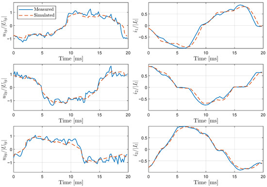 Comparison of the simulated and measured line-to-ground voltages and line currents during the refining stage.