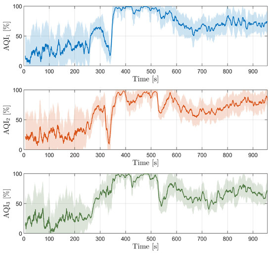 A graphical analysis of the AQI across all three lines of an EAF, from the final part of the melting stage to the refining stage, is shown in Figure 9. The AQI provides a quantitative assessment of arc performance and stability, with higher values indicating more favorable arc conditions. To improve the interpretability of the data and reduce the impact of transient fluctuations, a smoothing process is applied using a moving average filter and a standard deviation for the moving average. The filtering is applied over the past 50 samples, effectively tracing the underlying AQI trends and clarifying the development curve over time. Through a careful Cassie–Mayr parameter analysis, we set the optimal value for arc parameter . In order for AQI to provide a qualitative assessment of the arc quality, we set the value between zero and one, resulting in the following parameters: and .