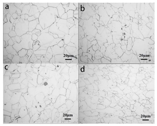 The microstructure of the GH4738 alloy under various degrees of deformation is shown in Figure 2. The figure illustrates how, following the upsetting deformation experiment, the sample’s grain size steadily reduced as the degree of distortion increased and there was no mixed crystal. The image also shows that the samples with the four deformation degrees had two sizes of grains, with the smaller grains around the bigger grains. This event shows that recrystallization is essentially finished. At the same time, when the degree of deformation is very low, the deformation is too slight, and the stored energy is insufficient to cause recrystallization; thus, the change in grain size is not immediately apparent. The grains are refined following recrystallization when the deformation exceeds the critical deformation, and the bigger the deformation is, the finer the grains become. Because the nucleation rate grows quickly and the stored energy driving nucleation and growth increases constantly as the deformation size increases, refining occurs as the G/N ratio decreases.
