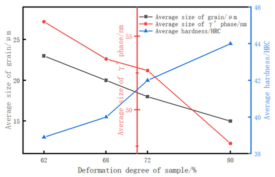 Comparison of average grain size, γ′ phase particle size, and hardness of samples with different deformation degrees.