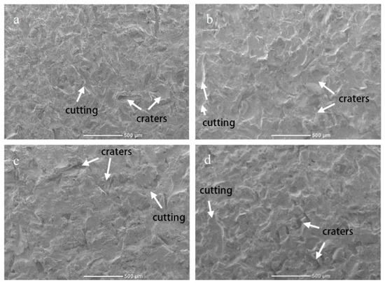 High-temperature erosion morphology of specimens with different degrees of deformation: (a) 62%; (b) 68%; (c) 72%; (d) 80%.