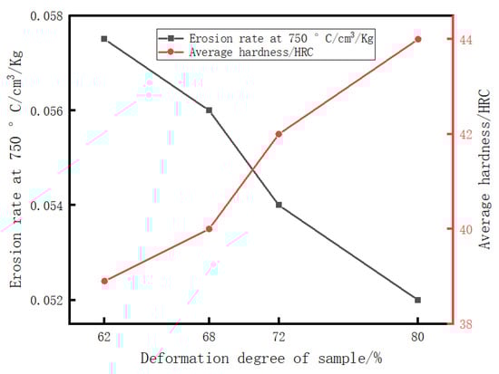 - Chiseling and a limited amount of cutting were the major characteristics of high-temperature erosion at 750 °C, which was mostly dependent on the impact deformation mechanism. The sample with an 80% deformation degree had a lower high-temperature erosion rate, which was decreased by 10.3% when compared to the sample with a 62% deformation degree. Furthermore, the harder the alloy was, the faster it corroded at high temperatures.