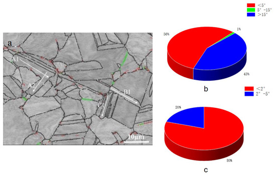EBSD diagram and distribution pattern of grain boundaries with different phase differences for GH4738 alloy. (a) EBSD diagram of forgings with a deformation of 80%; (b) the distribution of grain boundaries with orientation differences in different states of the alloy; (c) the distribution of <2°and 2–5° orientation difference grain boundaries in different states of the alloy.