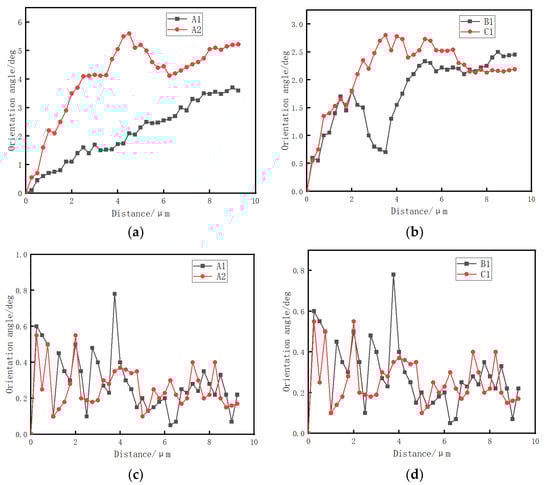 The distribution of the orientation angle along Figure 7a along straight lines is illustrated in Figure 8. According to the analysis of cumulative orientation angles in figures, the highest cumulative orientation angle of deformed grains in GH4738 alloy forgings was only 5.8°. During the heating process prior to forging, the second phase in the alloy and the majority of primary carbides have completely returned to the matrix [29,30]. Consequently, there was minimal presence of precipitated phases impeding the grain boundary during deformation. The primary mechanism for the nucleation of recrystallized grains was the initial bending of the grain boundary, while the major nucleation process was the discontinuous dynamic recrystallization mechanism. The granular M23C6 carbides were dispersed and precipitated on the recrystallized grain boundaries and twin boundaries during the cooling process following deformation. This formed the basis for alloy strengthening through the pinning of recrystallized grain boundaries and twin boundaries.