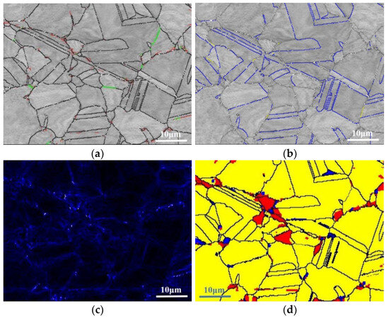 EBSD diagram of GH4738 alloy forgings with 80% deformation. (a) Angle diagram of orientation difference between grains (>15°, 5~15°, and 2~5° black line, green line, and red line are used in turn); (b) Σ3, Σ9 twin boundary (indicated by blue line and yellow line in turn); (c) dislocation density diagram between grains (increased from blue to white in turn); (d) distribution of recrystallized grains (indicated by blue, yellow, and red areas for complete recrystallization, substructure, and incomplete recrystallization in turn).