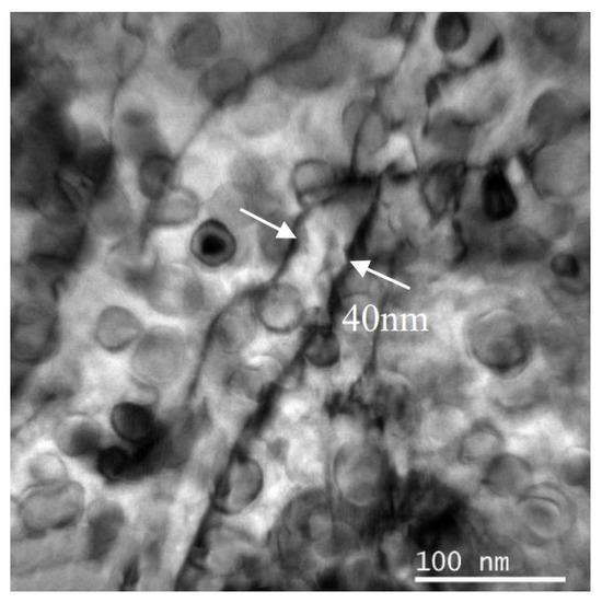 The TEM image of the GH4738 alloy forgings in Figure 10 reveals a dislocation spacing of approximately 40 nm. The most effective strengthening occurred when the initial dislocation cut into the γ′ phase, while the subsequent dislocation simply sheared off the γ′ phase. This observation further confirms that 40 nm is the optimal particle size for the γ′ phase, and this size significantly influences the precipitation strengthening of the alloy. Consequently, as the level of deformation increased, the size of the γ′ phase particles and the spacing between them decreased, eventually converging toward 40 nm. This reduction in particle size and spacing enhanced the performance of the alloy.