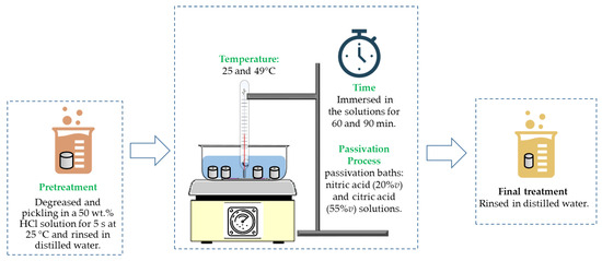 - Passivation stage: a total of two passivation baths using solutions of distilled water (analytical grade reagents), citric acid (55% v), and nitric acid (20% v) were utilized.