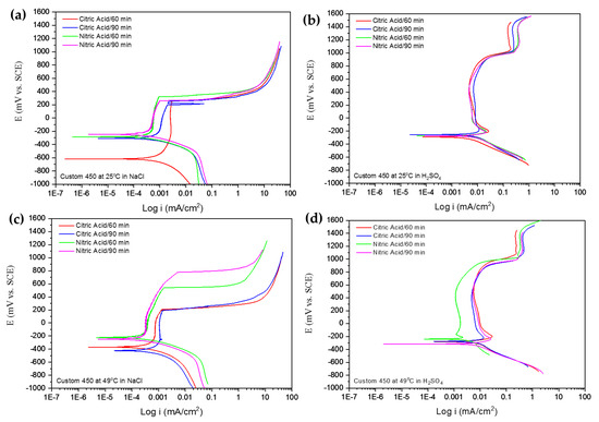 Potentiodynamic polarization curves for Custom 450 samples passivated in citric and nitric acids at 25 and 49 °C for 60 and 90 min: (a,c) NaCl and (b,d) H2SO4 solutions.