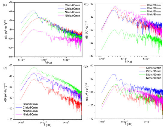 PSDs in currents for Custom 450 passivated at 25 °C exposed to (a) NaCl and (b) H2SO4 solutions and Custom 450 passivated at 49 °C exposed to (c) NaCl and (d) H2SO4 solutions.