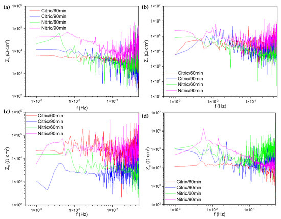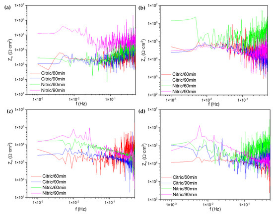 When samples were passivated at 49 °C, the citric/90 min sample showed a lower performance against corrosion, with a Zn0 value of 5768 Ω·cm2. The other samples presented similar behaviors with high Zn0 values (see Table 5). The higher corrosion resistance values of nitric acid-passivated samples are shown in Figure 8d, meaning that the nitric acid passivation produces better results against corrosion.